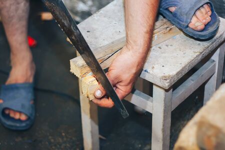A man carpenter cuts a wooden beam using a handsaw, male hands with a saw closeup. Work with wood