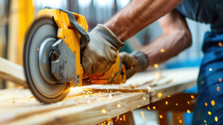 A focused craftsman uses a circular saw to cut through wood in a workshop, showing sparks flying as he works. The scene captures the effort and precision of woodworking.