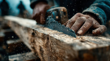 A close-up view of hands using a saw on a wooden plank, showcasing the detailed craftsmanship involved in woodworking. Shavings and dust highlight the artistry.