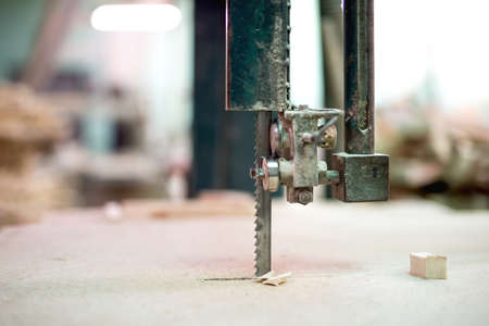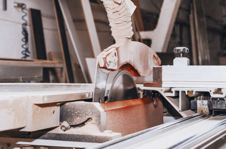 Sawing machine for wood in the workshop for the production of furniture. Woodworking circular saw and wooden bar for cutting.