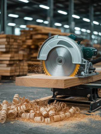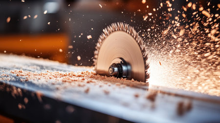A dynamic shot of a circular saw in action, cutting through wood. Sparks and shavings fly as the blade rotates, showcasing the power and precision of woodworking tools in a workshop setting.