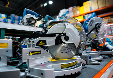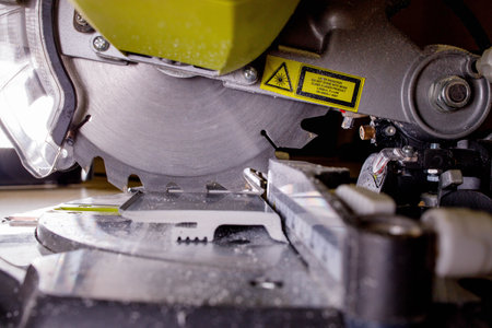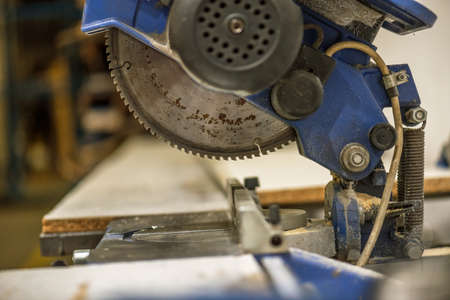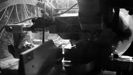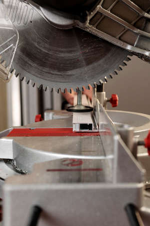 industrial sliding compound mitre saw used for cutting pvc, plastic and metal at production factory