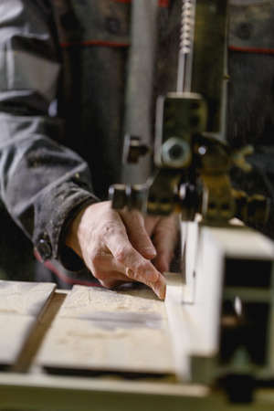 Cabinet planer machine is working with sawdust at wood workshop . Process of work surf gage machine