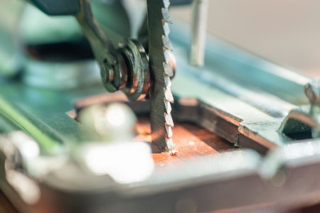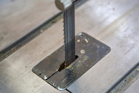 Close up of a fast moving industrial band saw blade cutting through metal, showcasing the machinery and process involved in metal fabrication within a manufacturing facility