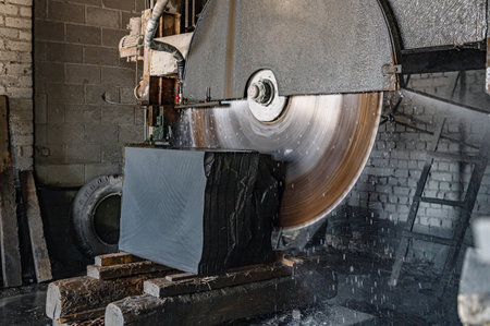 Saw for cutting edge. Large cutter cuts granite. stone processing machine. Stone cutting at the factory
