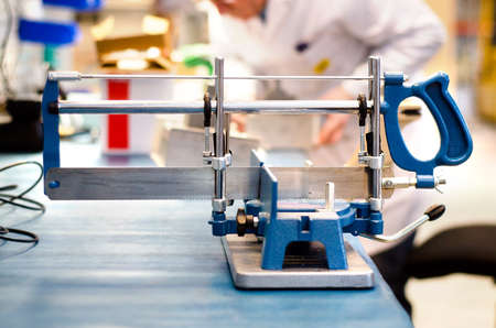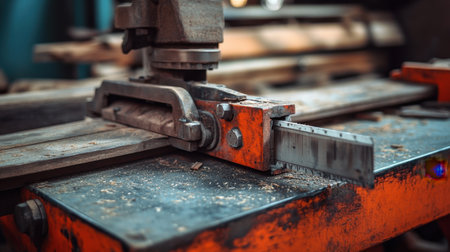 A detailed close-up of an industrial workshop tool showcases precision and craftsmanship, highlighting the orange and steel elements on a wooden surface in a working environment.