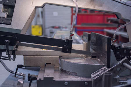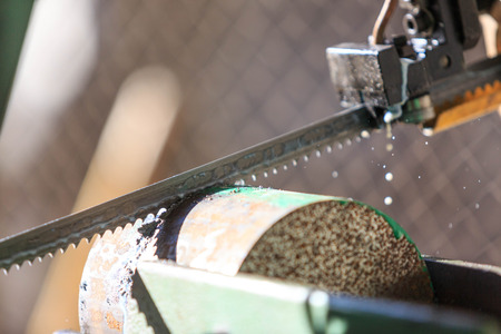 Close up scene the operation of band saw cutting machine cutting the metal shaft parts with coolant method. The machine tool for industrial purpose.