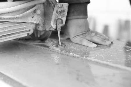 The employee's hands in focus cut the bar on a blurred background with a jigsaw machine. Front view