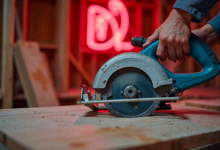 Person using a circular saw to cut a piece of wood. Fine sawdust is flying. The focus is on the hands of the person and the circular saw in action. The image highlights the process of woodworking.