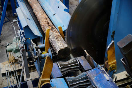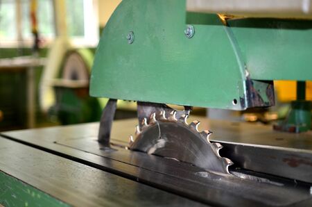 Carpenter equipment for forest processing. Industrial woodworking machine with a electric circular saw, wood machinery