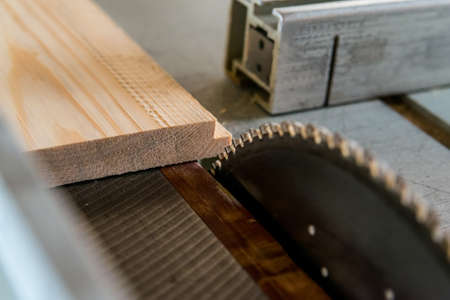 Circular saw cutting wooden plank. Blade with board close-up. Woodworking detail with wood. Working equipment carpentry workshop.