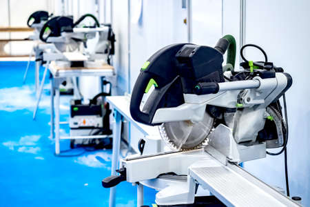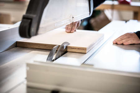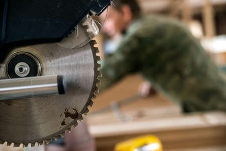 Carpentry workshop. Circular saw for wood. Carpenter services. Woodworking Machine. Making furniture to order. Furniture shop.