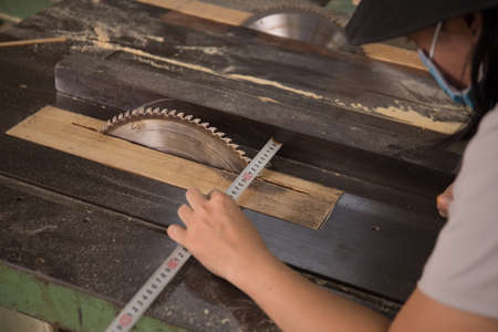 Carpenter use Circular Saw to cut wooden board for D.I.Y hobbie work.