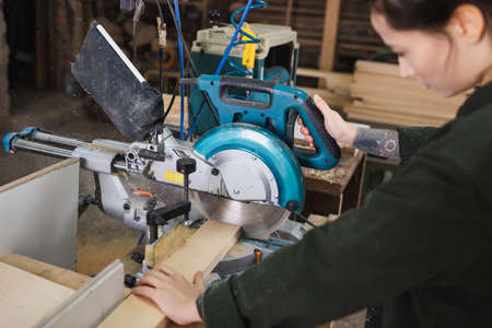 Saw the board. The man saws the board with an electric saw. Joinery. The joiner.