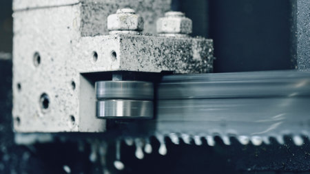 Close up view of an automated band saw cutting through a metal profile in a metalworking plant, with coolant spraying, highlighting the precision of the industrial manufacturing process