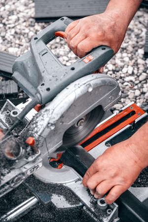 Roof construction building. Work on circular saw. Sawing wooden elements.