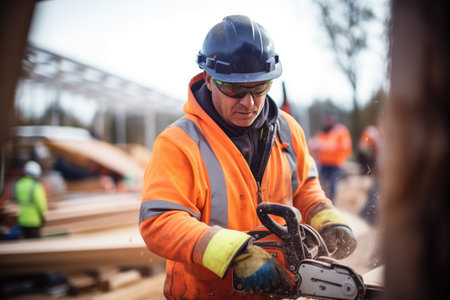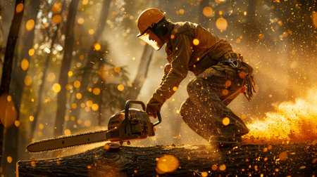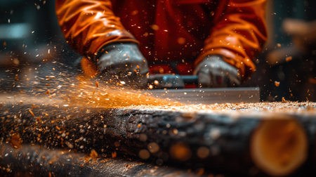An AI generated illustration of a man using a handheld saw to cut a log of timber