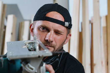 Portrait of a male carpenter who checks the sharpening of a circular saw. garage repairs