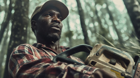 Portrait of an African-American lumberjack with a chainsaw