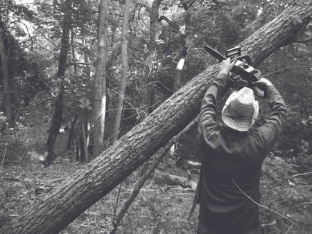 Man holding a chainsaw and cut trees. Lumberjack at work wears orange personal protective equipment. Gardener working outdoor in the forest. Security professionalism occupation forestry worker concept