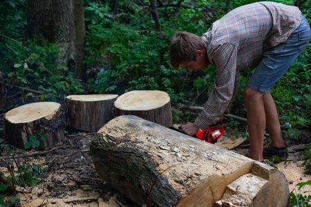 man cut felled trees, a working guy cuts stumps with a chainsaw in the forest outdoors