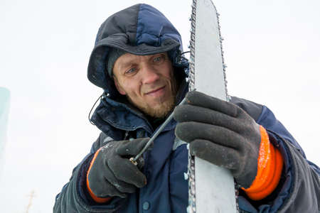 A manual file worker sharpens a chainsaw chain