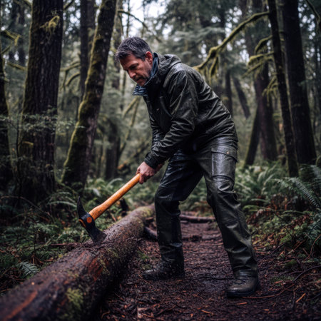 Man in waterproof gear chopping a mossy log with an ax in a wet forest.