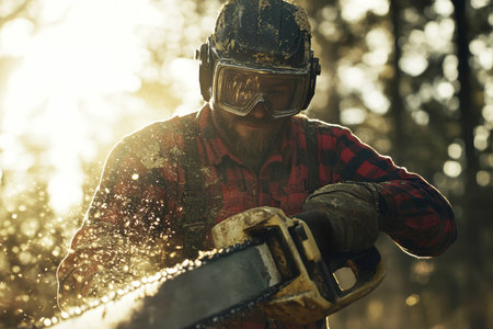 A lumberjack in a checked shirt operates a chainsaw, cutting through a tree in a forest.