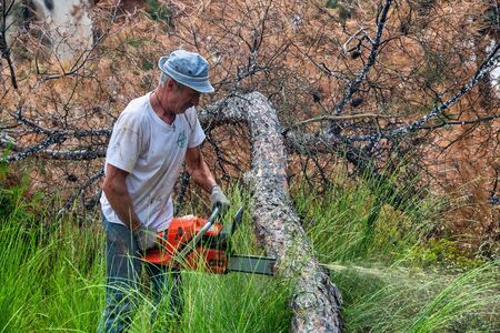 Thessaloniki, Greece - June 26, 2019: Lumberjack work wirh chainsaw in the forest with coniferous trees for industrial exploitation in the suburban forest of Thessaloniki