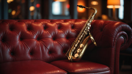 Polished brass saxophone positioned on luxurious red leather furniture creates sophisticated musical ambiance. Warm bokeh lighting and vintage interior perfect for music, hospitality, entertainment...