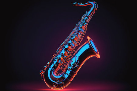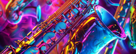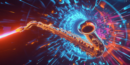 The majestic saxophone, blurred into strings and neon, creates an artful symphony of color and form.