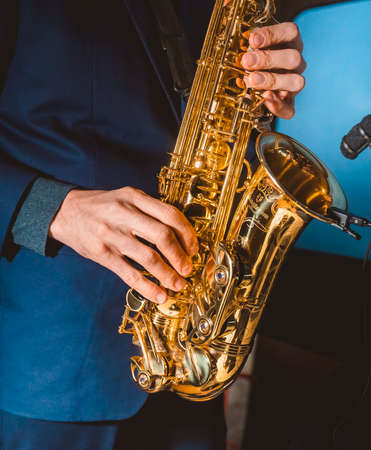 Saxophone player Saxophonist playing Jazz music instruments close up musicians hands
