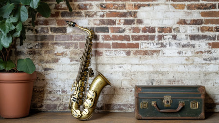This image features a vintage saxophone elegantly placed next to a green plant and rustic box, set against a textured brick wall, evoking a musical atmosphere.