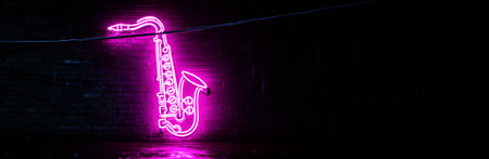 Glowing neon pink saxophone on dark brick wall. That the image is generated using AI.
