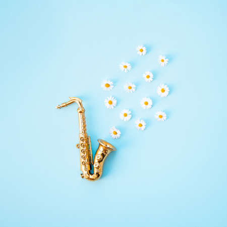 A golden saxophone from which Shasta daisy flowers hatch. Minimal concept on a light blue background