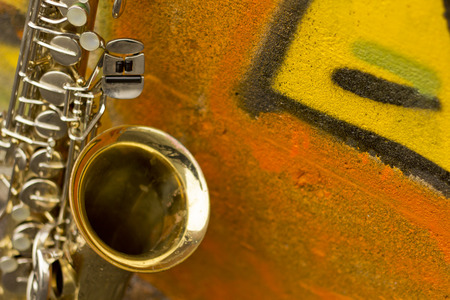 Old and worn Jazz saxophone and piano keyboard musical show and performance
