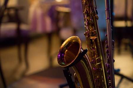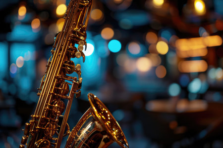 Sax with glaming brass finish, reflecting a lively atmosphere, possibly at a jazz club.