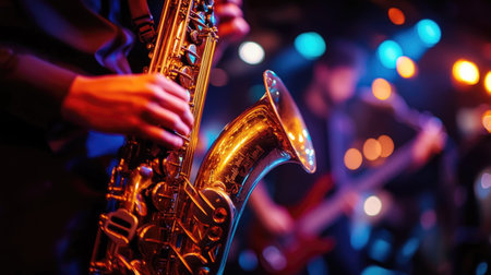 Experience the energy of live jazz with a close-up of a saxophone. The vibrant lights create an exciting atmosphere for music lovers and performers alike.