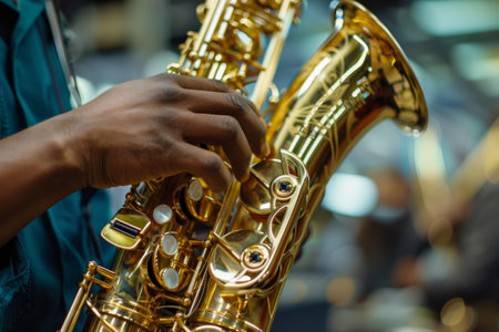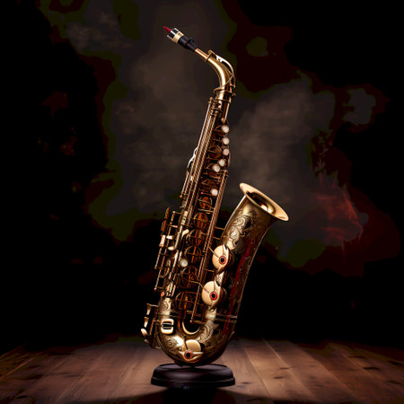 A saxophonist passionately playing a smooth jazz melody, with the instrument gleaming under stage lights.