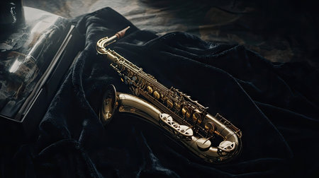 A classic tenor saxophone resting on a black velvet cloth, emphasizing its polished brass details.