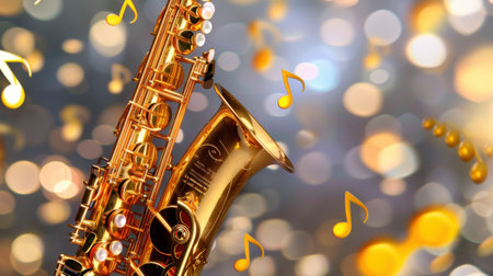 This vibrant image captures an elegant golden saxophone adorned with floating musical notes against a stunning bokeh background. Perfect for music-related themes.