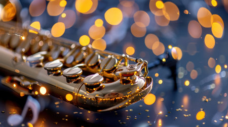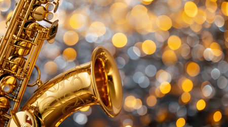 This stunning close-up captures the elegance of a polished saxophone against a dreamy bokeh background, creating a vibrant and festive atmosphere perfect for any music lover.