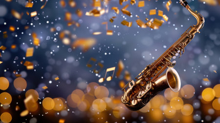 A stunning golden saxophone stands out against a backdrop filled with musical notes and colorful confetti, creating a lively and festive atmosphere.