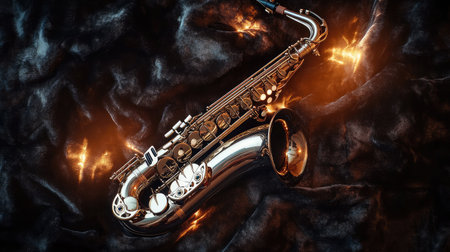 A stunning close-up view of a silver saxophone resting on dark velvet, illuminated by soft sparkles, showcasing the artistry and elegance of musical instruments.