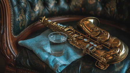 Saxophone resting on a leather chair beside a glass of water and cleaning cloth