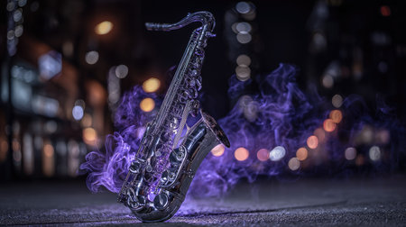 A shiny silver saxophone is featured, surrounded by a dramatic purple smoke effect. The image showcases a dark, city night scene with blurred lights creating a bokeh effect. This visual concept could be suitable for music-related projects, promotional materials, or various creative endeavors.
