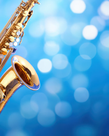 Golden saxophone glistens, surrounded by captivating blue bokeh lights, embodying the vibrant spirit of International Jazz Day festivities.