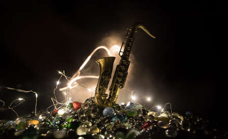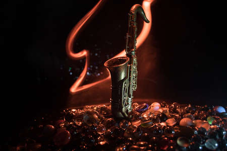 Music concept. Saxophone jazz instrument. Alto gold sax miniature with colorful toned light on foggy background. Saxophone music instrument in lowlight. Selective focus