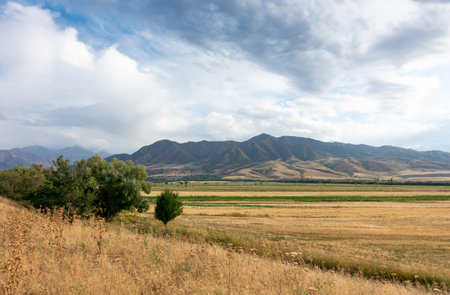 Beautiful summer mountain landscape. Wheat fields and mountains. Kyrgyzstan. Natural background.