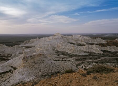 Chalk cliffs and ledges of the plateau Aktolagai. Plateau Aktolagai, Kazakhstan 2019.Expedition site Turister.ru.